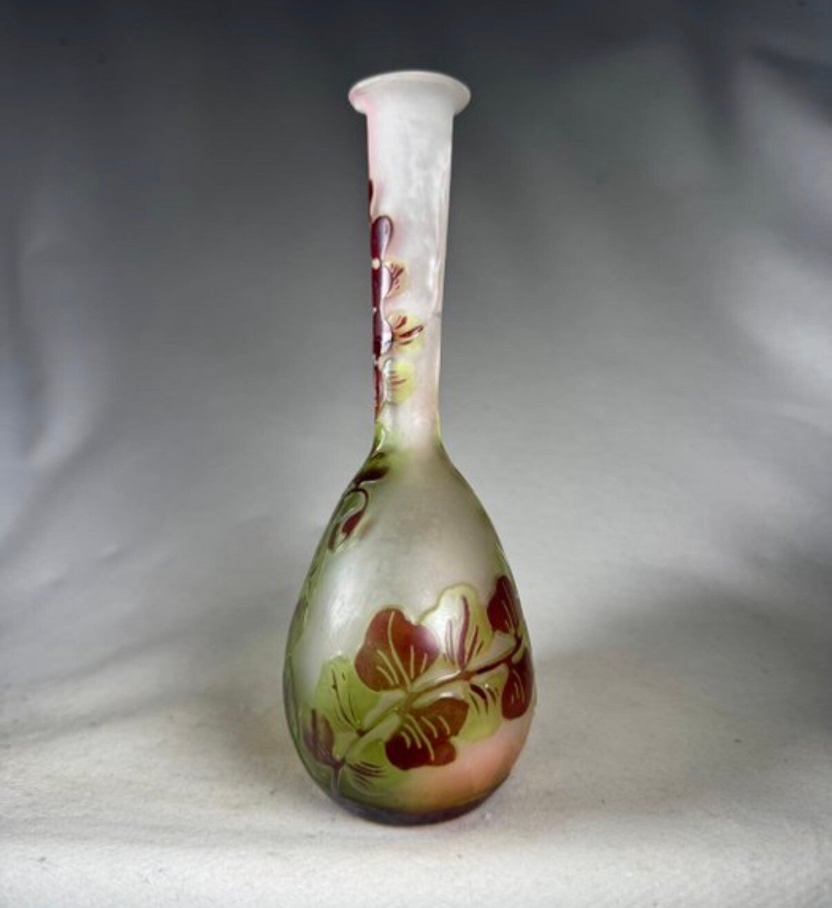 Dit is een prachtig voorbeeld van een soliflore vaas van de beroemde Franse glaskunstenaar Émile Gallé. dit exemplaar is elegant en bijna fragiel door de lange, slanke hals.