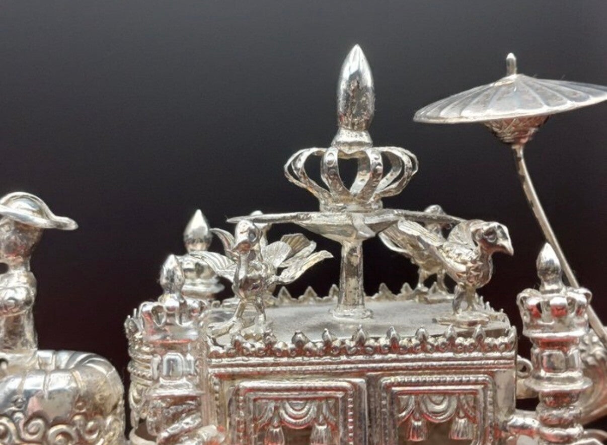 Bent u op zoek naar een uniek verzamelobject of een exclusief pronkstuk voor uw interieur? Deze gedetailleerde zilveren koets, getrokken door een vierspan paarden, is een schitterend voorbeeld van fijnmazig zilversmeedwerk. Met een gewicht van maar liefst 350 gram voelt het object solide en waardevol aan.